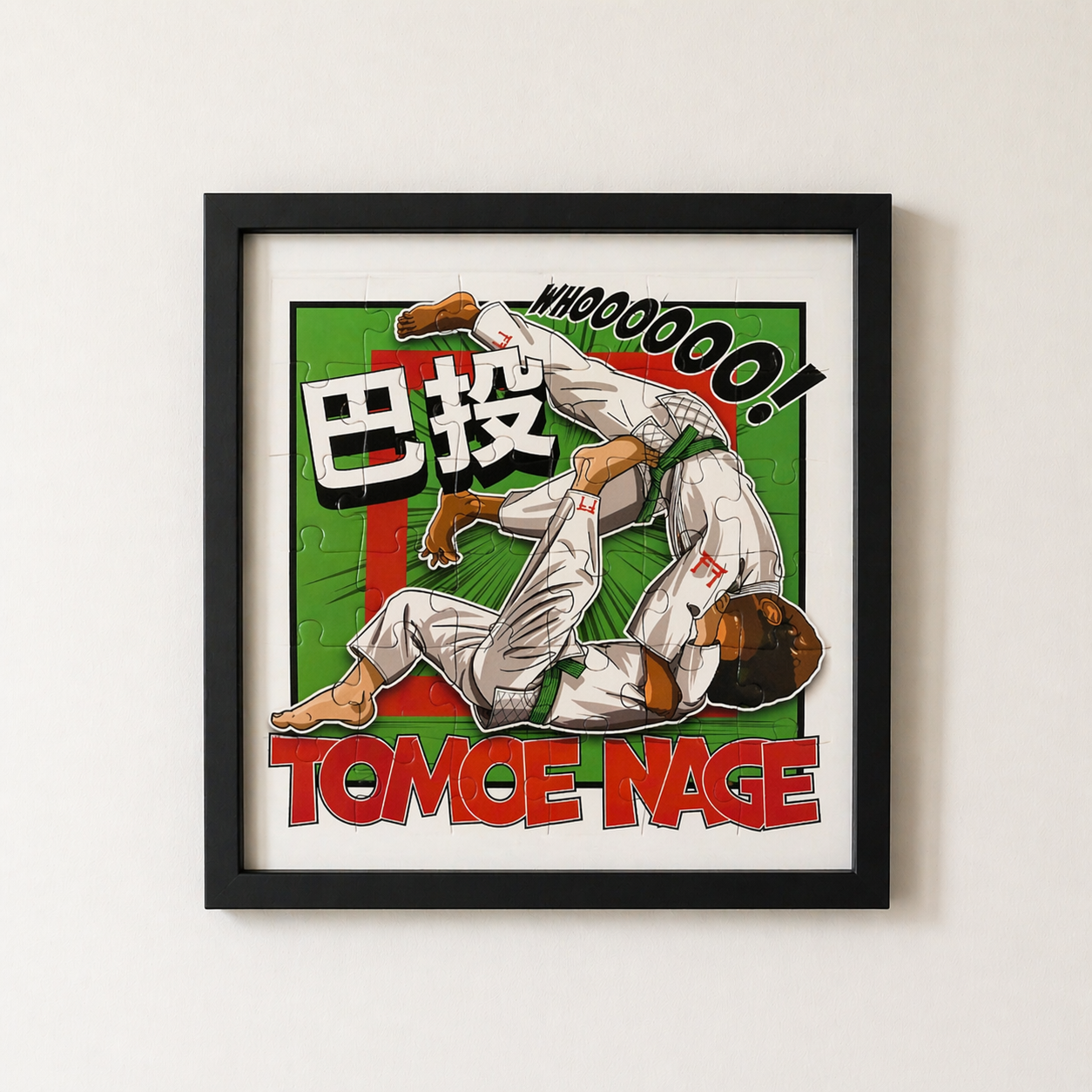 Il secondo puzzle rappresenta Tomoe Nageuna delle tecniche più emblematiche del judo. Con il suo sfondo verde e rosso, la stuoia del tatami e il nome giapponese della tecnica, immerge immediatamente i bambini nel mondo del dojo e delle mosse iconiche del judo.