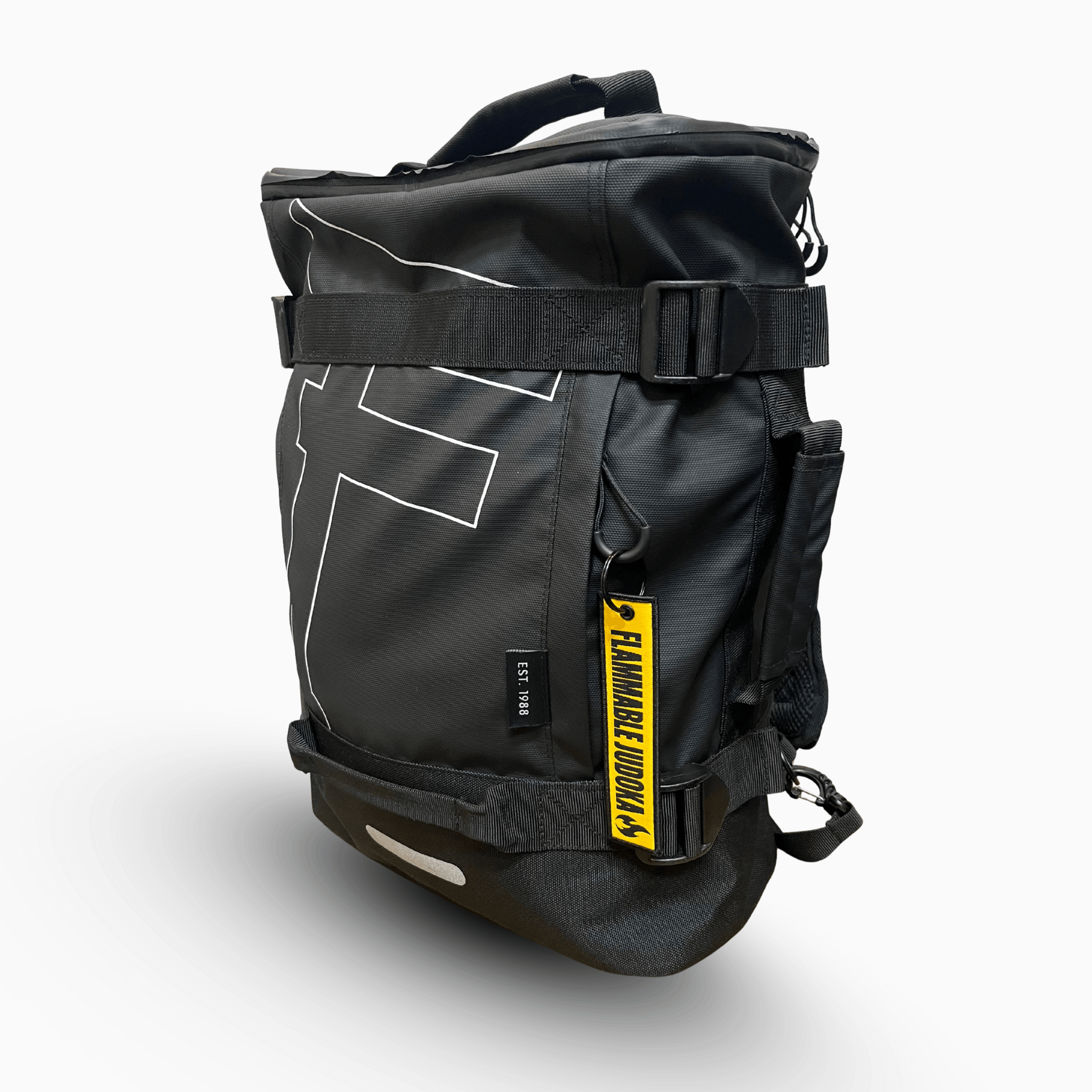 Sur la face avant, l’inscription FLAMMABLE JUDOKA en lettres noires imposantes sur fond jaune vif s’inspire des célèbres tags aéronautiques. Un clin d’œil puissant : attention, judoka prêt à s’enflammer sur le tatami !