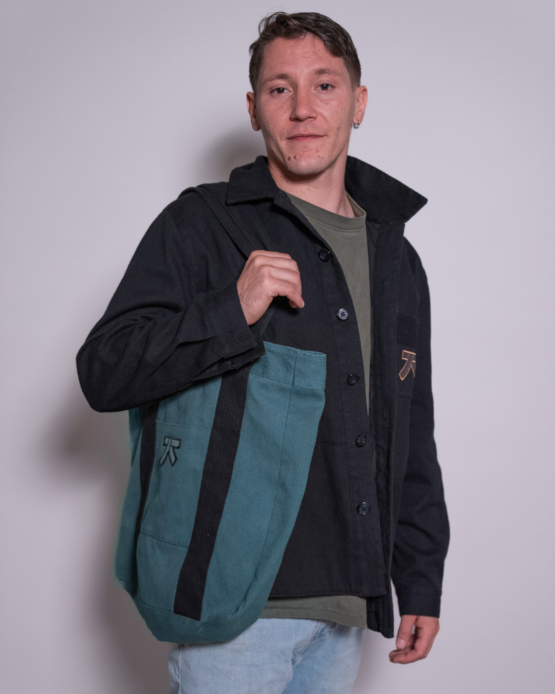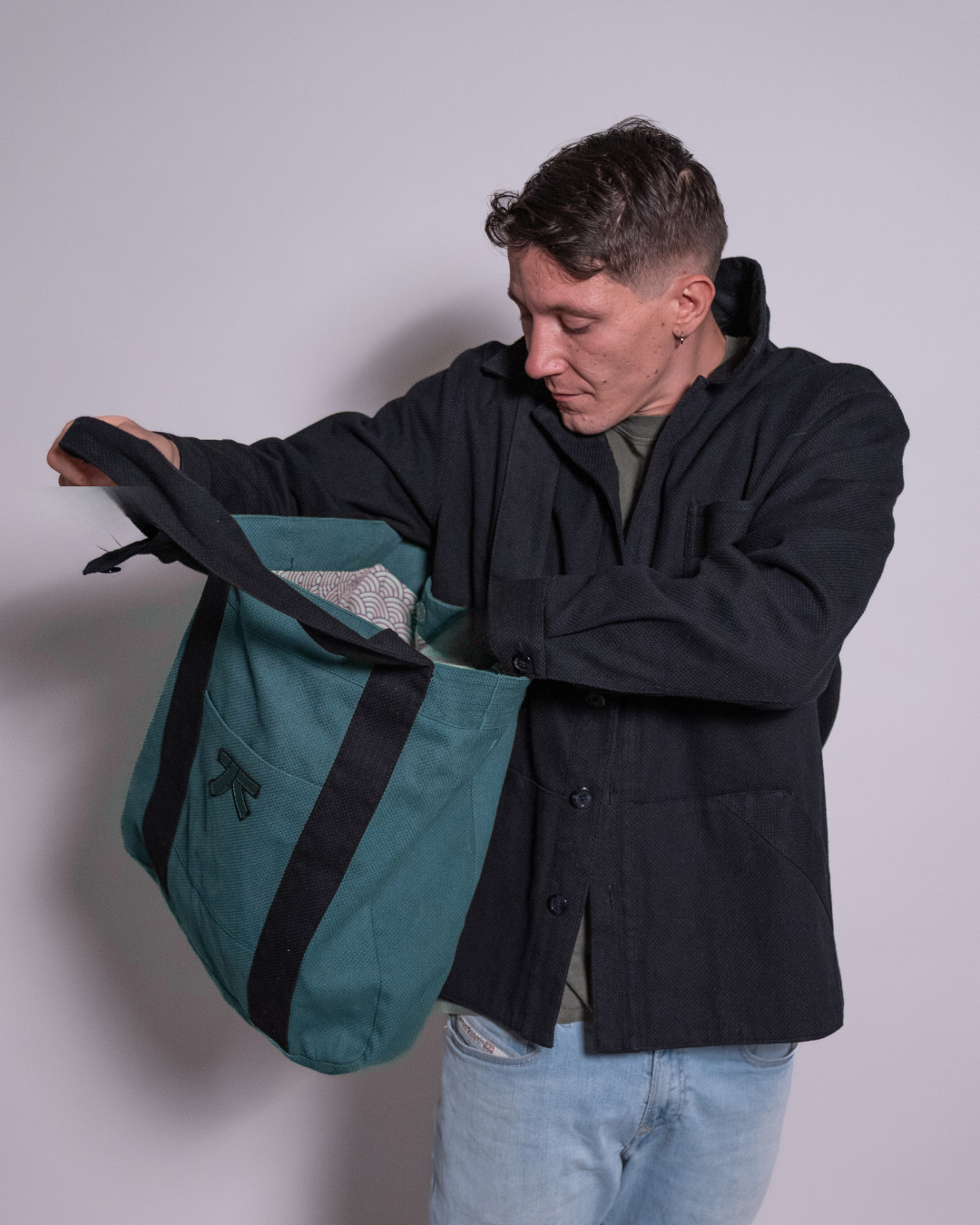 Inspiré des kimonos de judo japonais, ce tote bag en toile de kimono Contrôle allie tradition et fonctionnalité. Confectionné en toile de kimono robuste, il arbore une teinte Kaki ou bleu pétrole sophistiquée, unique.