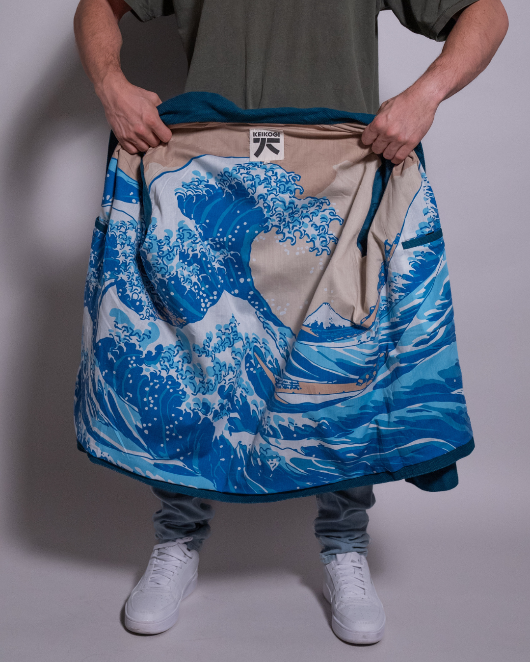 🔹 Doublure (optionnelle) : la Grande Vague de Kanagawa, imprimée à l’intérieur de la surchemise, un hommage à l’art japonais et à l’un de ses plus grands symboles.